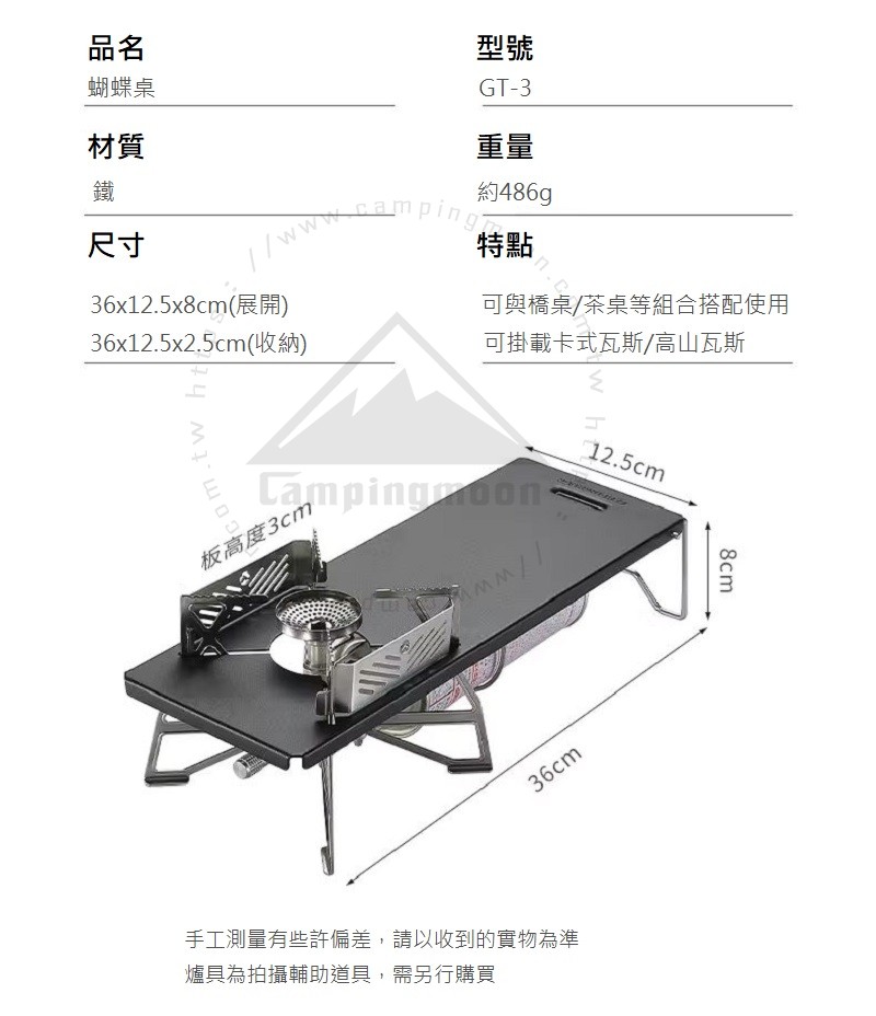 GT-3 半單位爐架搭配柯曼蝴蝶爐 (XD-3F),可以單獨做爐桌