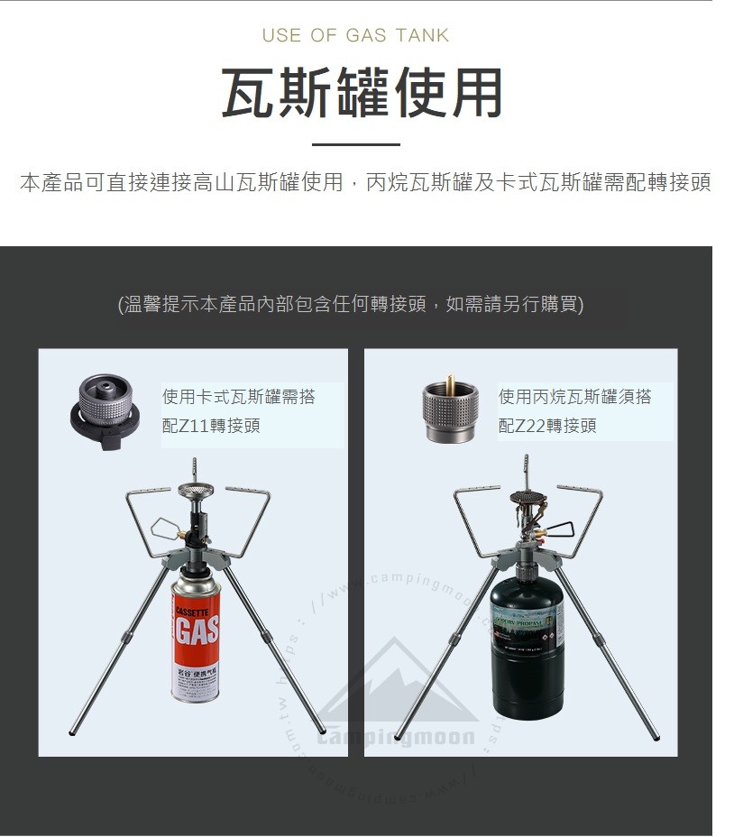 • 本產品可直接連接高山瓦斯罐使用,卡式瓦斯罐需另搭配Z11轉接頭