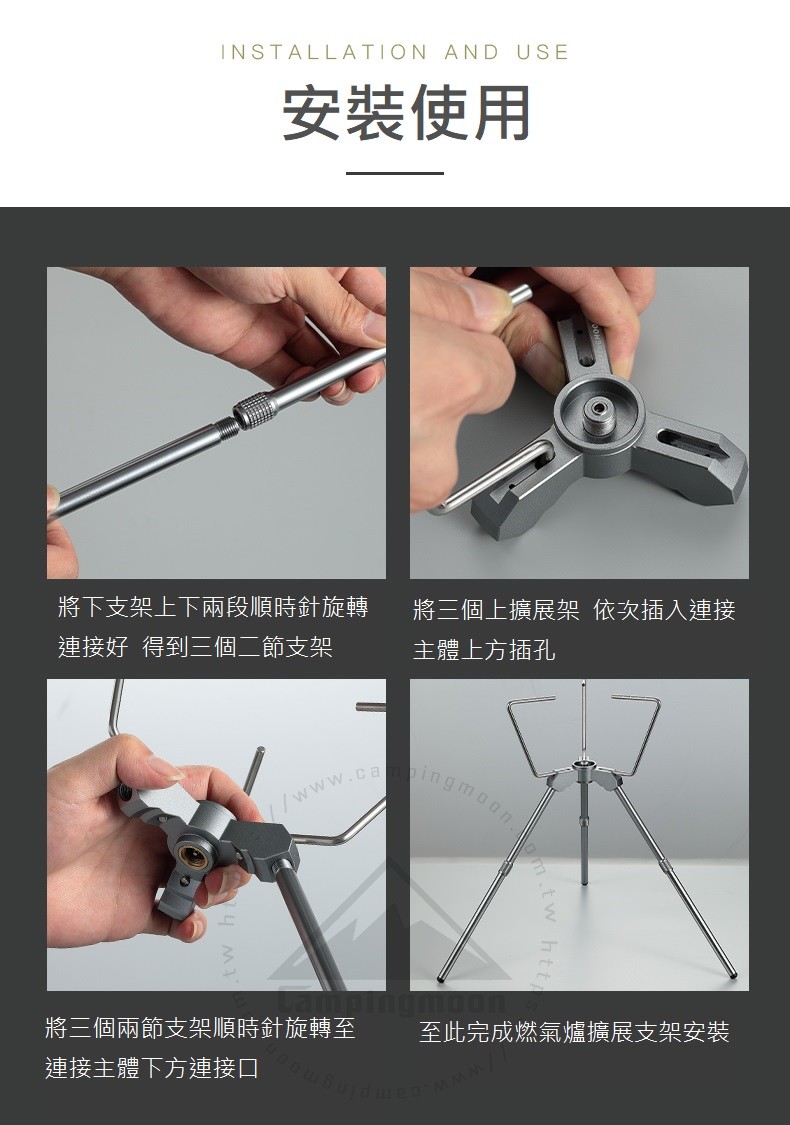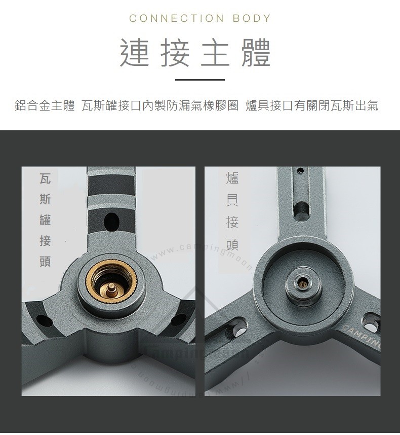 • 鋁合金主體,瓦斯罐接口內置防漏氣橡膠圈,爐具接口有關閉瓦斯出氣